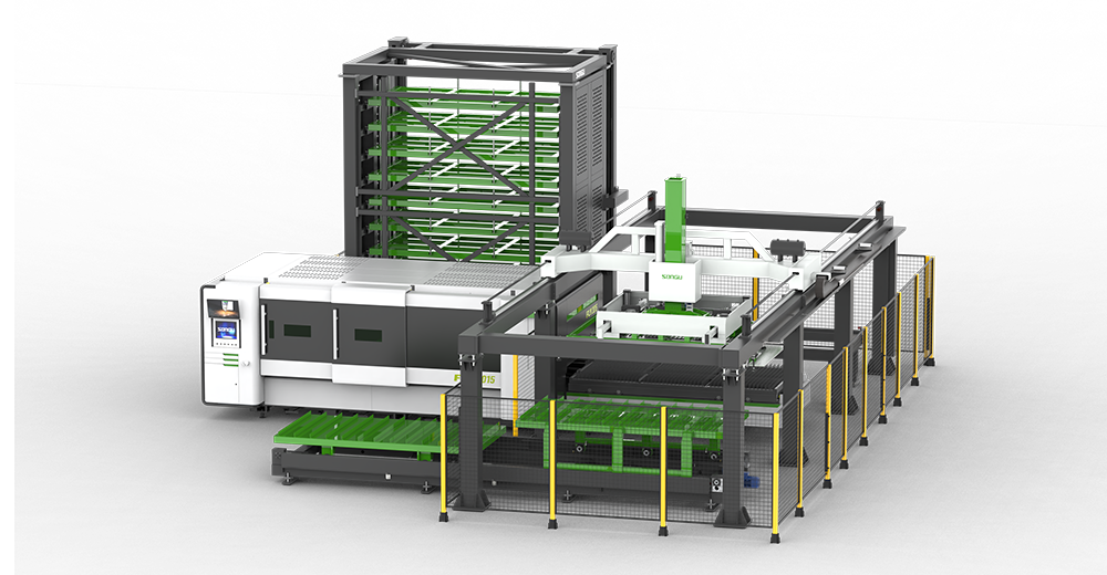 在松谷激光切割機(jī)的切割平臺(tái)上搭載 HyStore 系列自動(dòng)上下料及倉儲(chǔ)系統(tǒng),通過軟件控制系統(tǒng)進(jìn)行串聯(lián)控制,實(shí)現(xiàn)無人值守的全自動(dòng)化智能激光切割生產(chǎn)線;